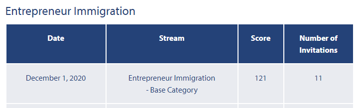 企业家移民基本类别:最低邀请分:121分,11人获邀。