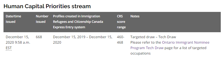 加拿大当地时间2020年12月15日,安省省政府(OINP)优才计划(Human Capital Priorities stream)向快速通道人才库中符合条件的候选人发放了668份省提名邀请。