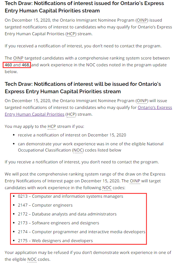安省移民厅针对CRS分数在460-468分之间,并且有相关职业工作经验的候选人,发放了这些邀请。
