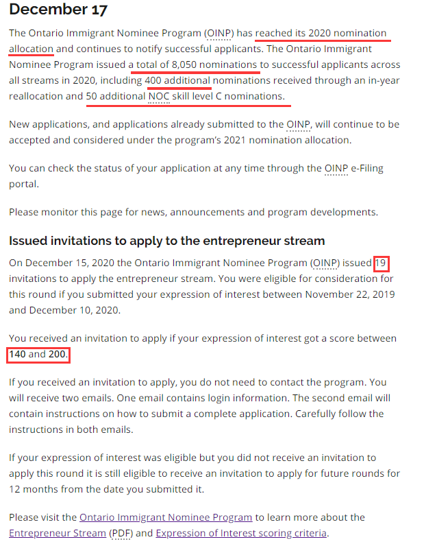 加拿大当地时间2020年12月17日,安省移民局发布最新公告:2020年安省省提名计划(OINP)分配名额已满。