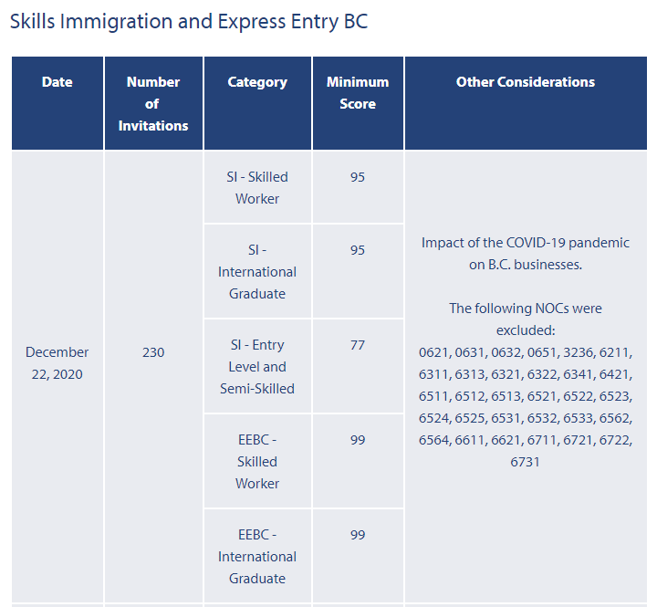 加拿大当地时间2020年12月22日,BC PNP发出了最新一轮常规邀请,本轮邀请人数降至230人,接近年末,BC PNP抽分结果明显上浮波动。
