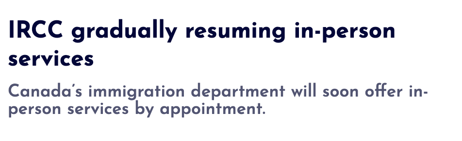 · 永居服务:IRCC办事处将重新开放,在安大略省的Etobicoke和蒙特利尔提供永居审核的相关服务。IRCC将通过电子邮件与申请枫叶卡或进行永居面试(确定永久居住地)的候选人进行预约。