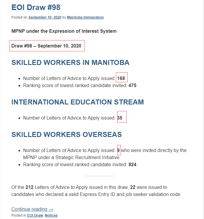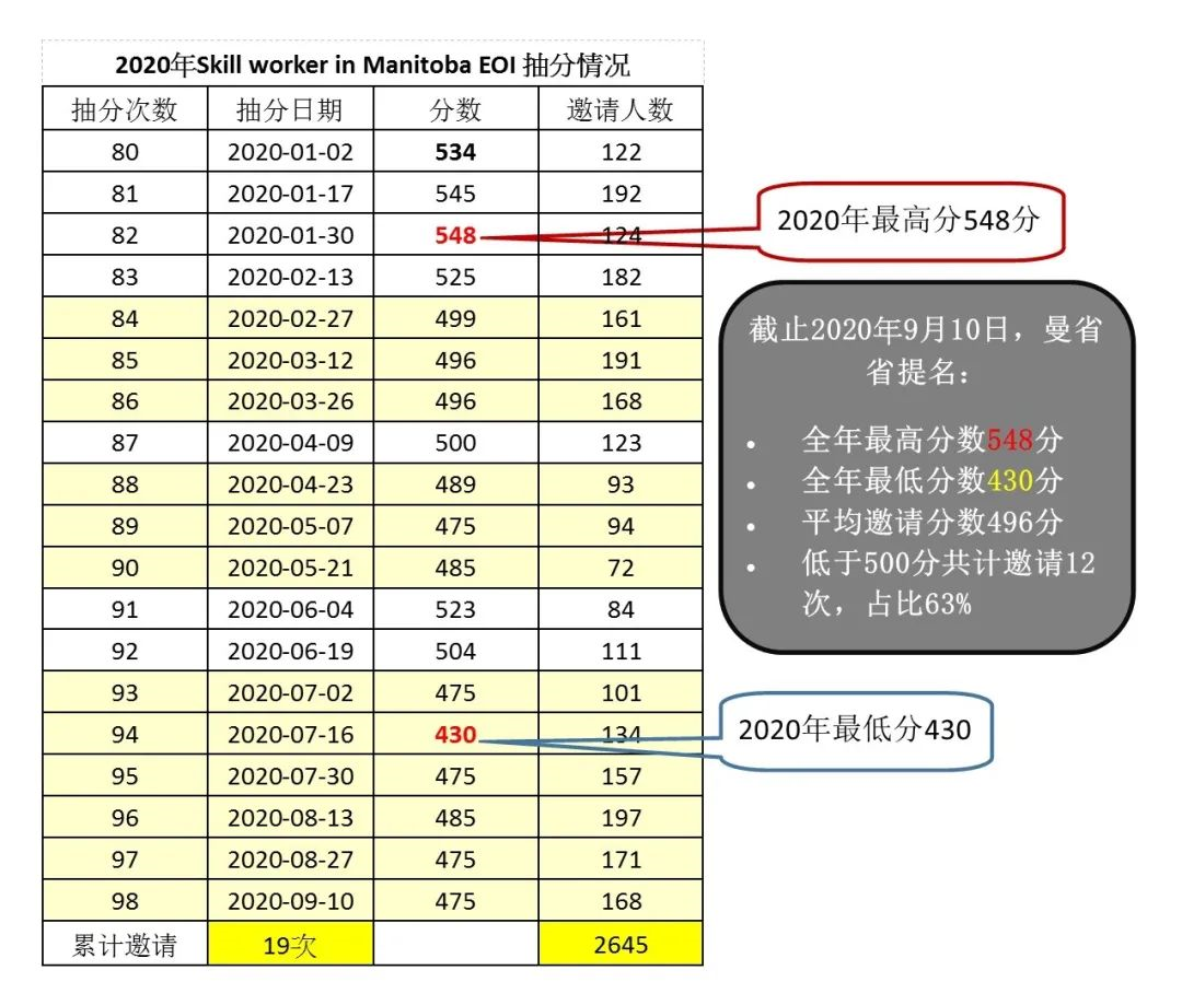 目前曼省省提名每两周一次抽分,共计邀请19次。目前平均邀请分数496分,最低一次仅430分。500分以下的邀请次数占63%。