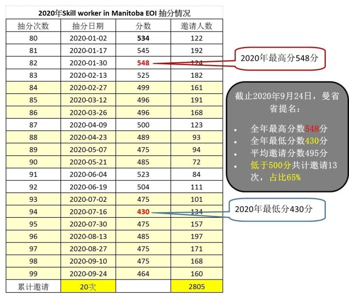 截止到2020年9月24日,曼省省提名每两周一次抽分,共计邀请20次。目前平均邀请分数495分,最低一次仅430分。500分以下的邀请次数占65%。