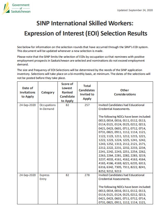 加拿大当地时间2020年9月24日,萨省技术移民无雇主类别又进行了新一轮的邀请。EE类别共发出278份邀请,最低分数82分;紧缺职位OID类别共发出257份邀请,最低分数82分;