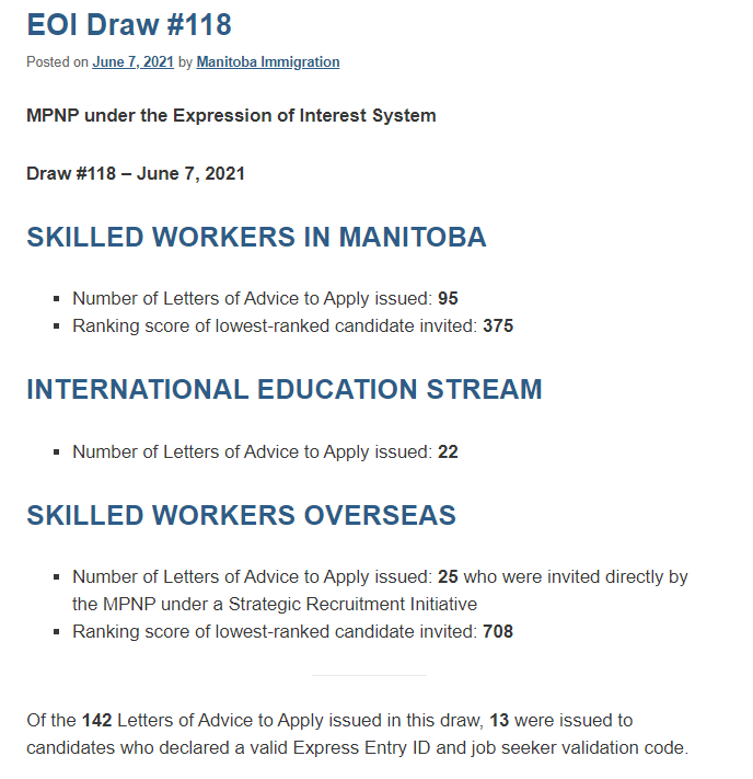 加拿大当地时间6月7日,曼省省提名第118轮邀请结果公布。