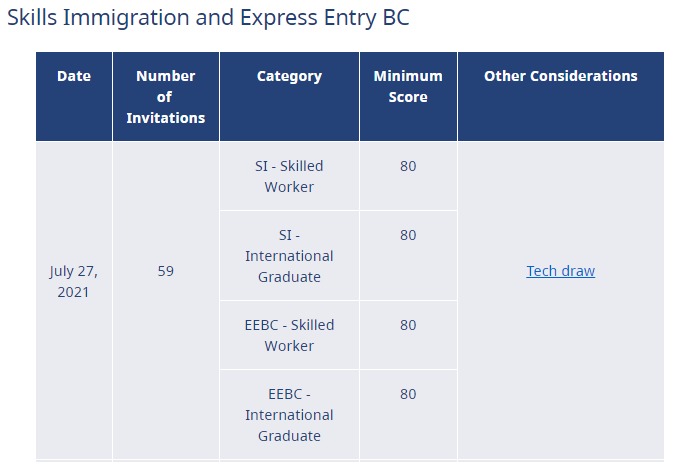 加拿大当地时间2021年7月27日,BC PNP Tech 发布最新一轮抽分结果。