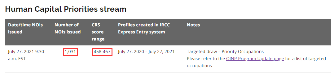 加拿大当地时间2021年7月27日,7安省省政府(OINP)优才计划(Human Capital Priorities stream)向快速通道人才库中符合条件的候选人发放了1031份省提名邀请。
