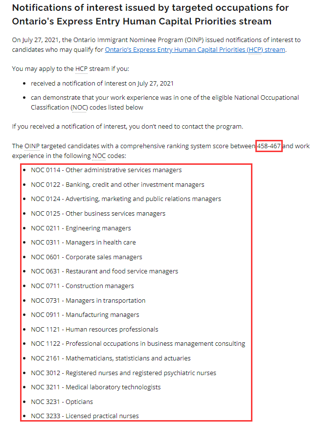 安省移民厅针对CRS分数在458-467分之间,并且有相关职业工作经验的候选人,发放了这些邀请。