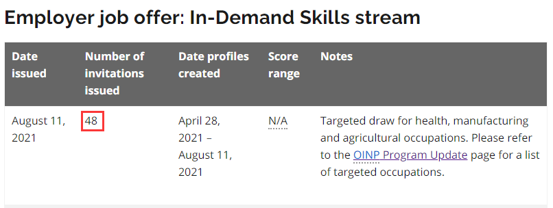 2021年8月11日安省发出本年度第二次雇主担保-紧缺职业类别邀请,本轮共邀请了48人。相较于7月15日的55人相比,邀请人数略有减少,但邀请职业仍保持不变。