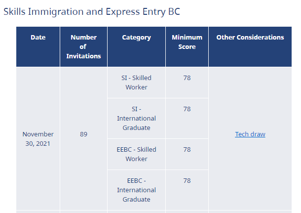 加拿大当地时间2021年11月30日,BC PNP Tech 发布最新一轮抽分结果。本轮Tech项目各项分数是78分,邀请人数为89人。较上轮邀请分数上涨3分,邀请人数增加2人。
