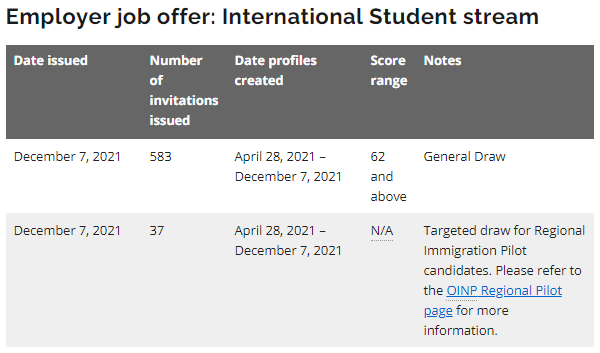 本轮安省雇主担保国际学生类别邀请最低分62分,邀请人数583人;该类别同时对区域试点项目发出37个邀请, 没设最低分;