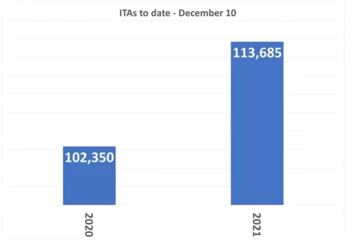 2020年联邦移民局总共通过EE项目发放了107,350份邀请,而截至到今日,2021年联邦移民局已发放了113,685份邀请,超过了本年度的移民目标,去年同期移民局只发放了102,350份邀请。