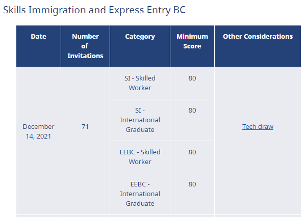 加拿大当地时间2021年12月14日,BC PNP Tech 发布最新一轮抽分结果。本轮Tech项目各项分数是80分,邀请人数为71人。较上轮邀请分数上涨2分,邀请人数减少18人。