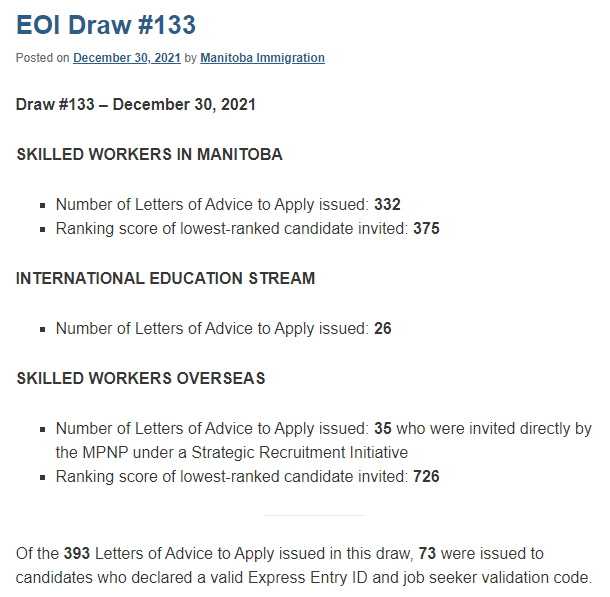 加拿大当地时间12月30日曼省省提名第133次邀请结果公布,这也是曼省2021年度最后一次邀请。