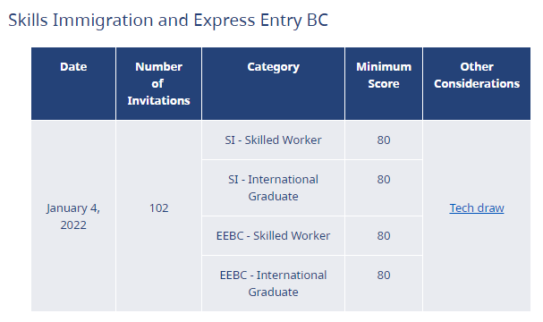 加拿大当地时间2022年1月4日,BC PNP Tech 发布新年第一轮抽分结果。本轮Tech项目各项分数仍然维持在80分,邀请人数为102人,较上轮邀请人数增加31人。
