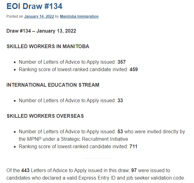 加拿大当地时间2022年1月13日曼省省提名第134次邀请结果公布,这也是曼省2022年度第一次邀请。