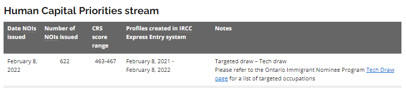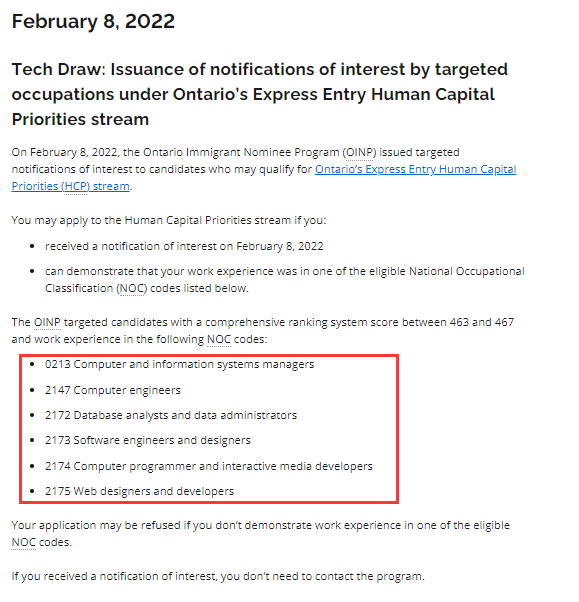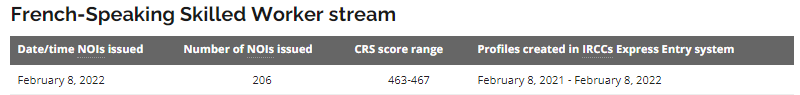 加拿大当地时间2022年2月8日,安省进行了一次大规模的移民抽选,主要针对的是在EE快速通道当中符合安省优才计划的候选人和法语技术工人。