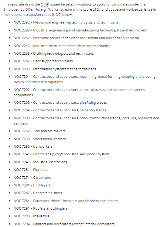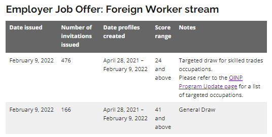 紧接着,当地时间2月9日,安省省提名项目又进行了一轮雇主担保类别的抽签,邀请了雇主担保海外工人类别、以及雇主担保紧缺职业类别的候选人。具体抽签情况如下: