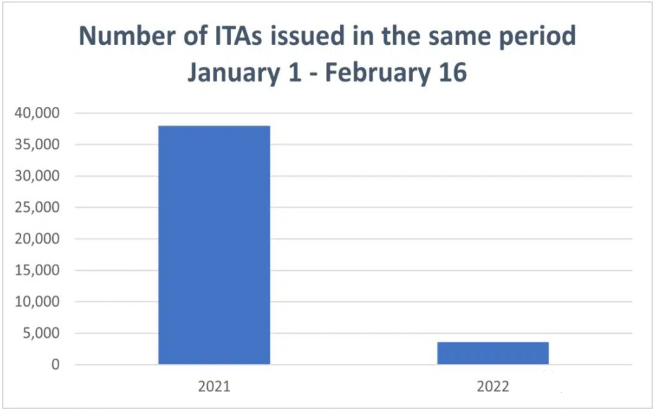 2022年截至到现在,联邦EE共发放3,580份邀请,去年同期,移民局发放了37,986份邀请。