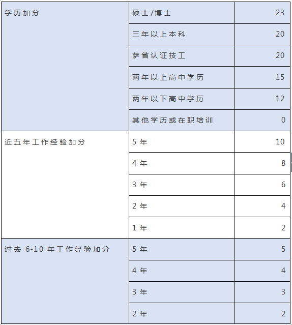 加拿大时间2018年1月4日(中国2018年1月5日凌晨4点多),萨省再次对职业清单进行调整,删除0124广告市场公共关系经理、1112财务和投资分析师、1123广告市场公关、2211化学技师及技术员、2241电子电气工程师技术员/技师。 萨省技术移民评分标准: