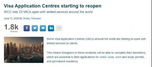 近日,加拿大联邦移民部也传来消息,决定重开世界各地的23个签证中心。