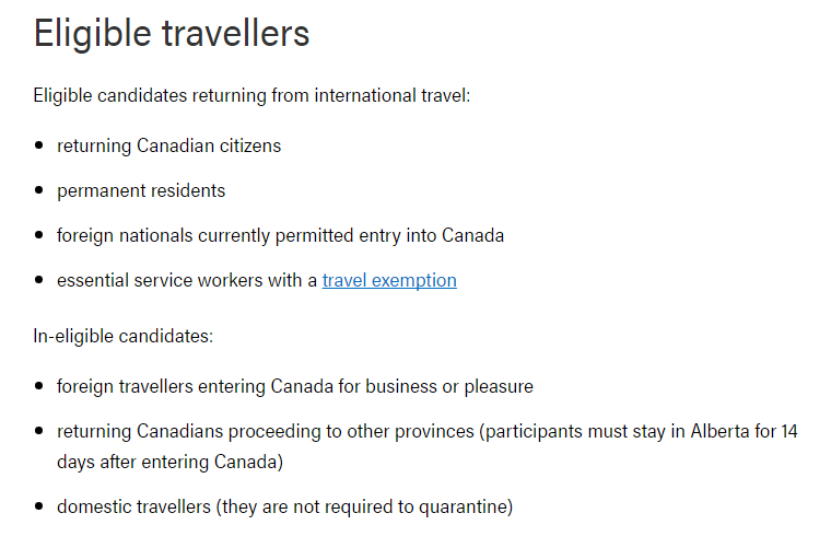 1、因商务或休闲目的进入加拿大的外国旅客2、返回加拿大但前往其他省份(参加试点必须在阿省停留14天);