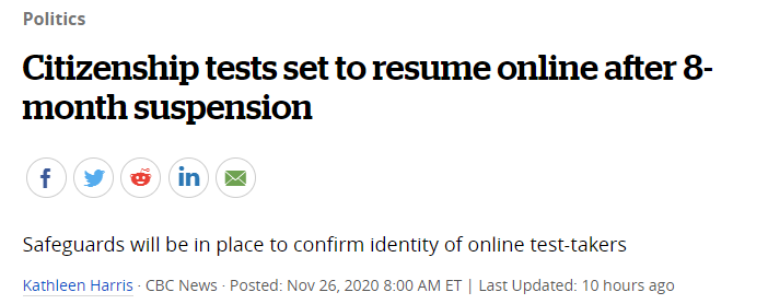 由于瘟疫大流行,IRCC于3月14日取消了所有公民身份考试,重考,听证和面谈。当时暂停的公民入籍仪式,已通过虚拟形式恢复。