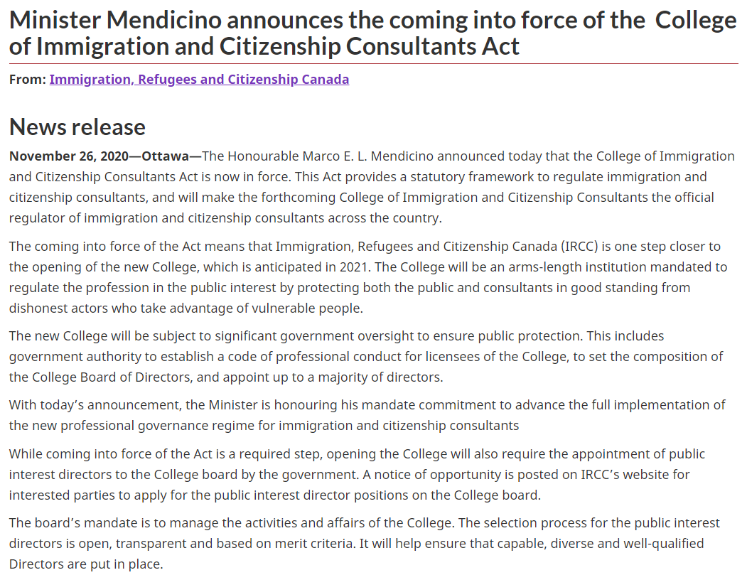 2020年11月26日加拿大移民部门迪奇诺宣布《移民与公民顾问公会法》(暂译名)现已生效。