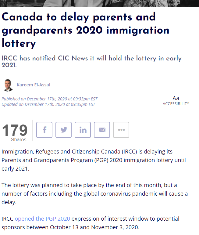 据CIC新闻最新消息,加拿大移民部将2020年的父母和祖父母团聚计划(PGP)抽签推迟至2021年初。