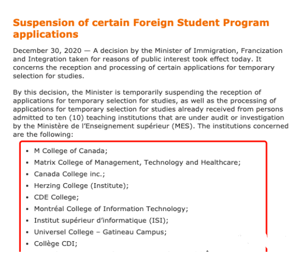 根据移民局官网给出的解释,魁省突然要求暂停这几所学校的CAQ申请,是因为这几所学校在国际留学生招生方面疑似存在争议行为,相关部门已经展开调查。