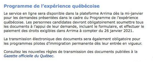 自2020年春天开始,这个网上递交系统已在Arrima平台上开通,但从2021年1月26日起所有PÉÉ的申请者将要求通过这个系统在网上递交申请资料。