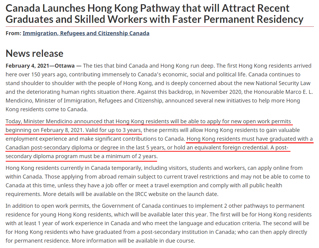 加拿大当地时间2021年2月4日,移民部部长Marco EL Mendicino宣布,自2021年2月8日起,符合资格的香港居民将可以申请一个新的开放工签,工签有效期长达3年。