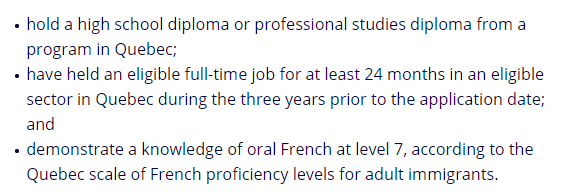 · 在过去三年内拥有至少24个月工作经验(其中12个月须在魁北克完成);