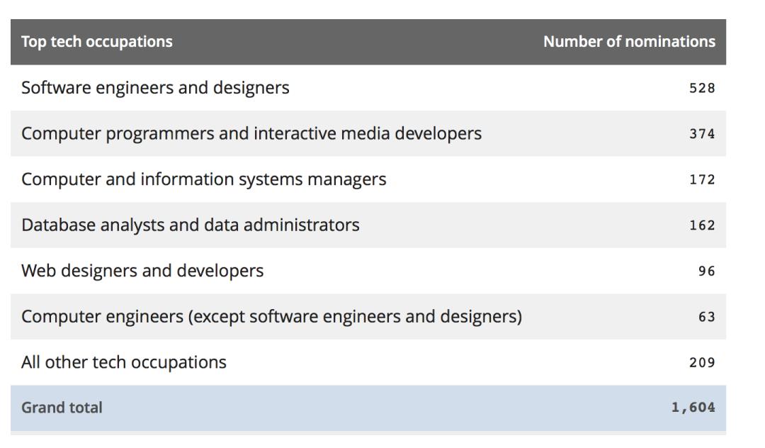 在所有提名中,大约有20%是针对在高科技行业工作的个人,共发放1,604份省提名,包括:软件工程师和设计师、电脑程序员、互动媒体开发商、IT系统分析师、技术顾问。