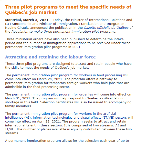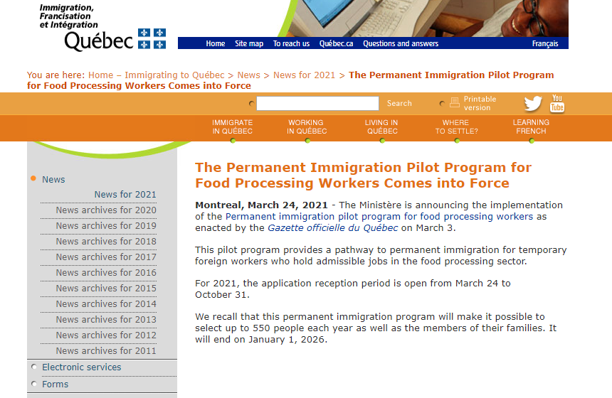 2021年3月24日魁北克省政府宣布,食品加工工人移民项目成为永久移民试点项目,并正式实施。