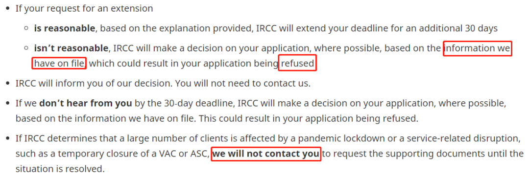 如果IRCC认为你提供的解释是合理的,则会将你的截止日期再延长30天。如果你的解释被认为是不合理的,IRCC将根据他们目前所拥有的信息对你的申请做出决定,这可能会导致你的申请被拒。