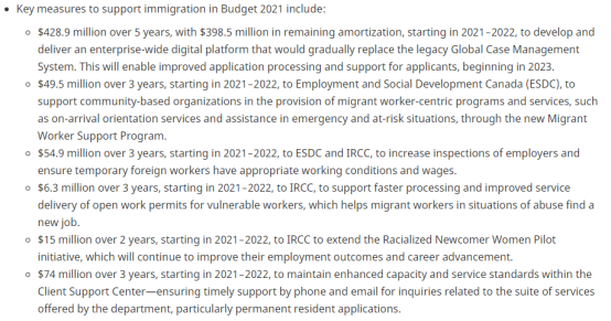2021年预算案承诺通过以下方式改善加拿大移民:提供现代移民处理平台;加强临时外国工人计划;加快通往永久居
