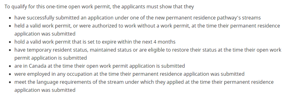 此外,申请人的配偶以及18岁或以上的受抚养子女,如果也在加拿大,也有资格根据这项政策申请开放式工签。