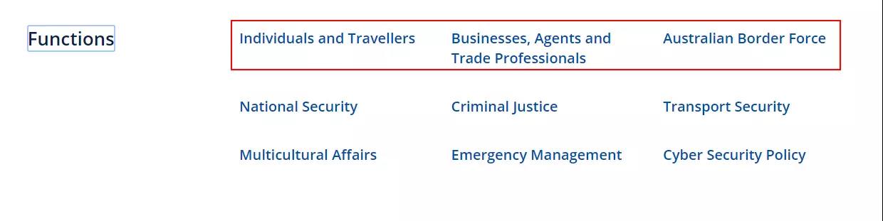 原来的移民局官网基本上被拆分成【Individuals and Travellers】、【Business, Agents and Trade professionals 】以及【Australian Border Forece】三大板块