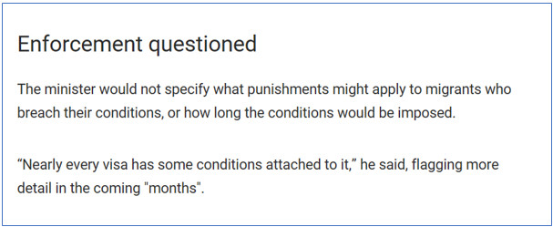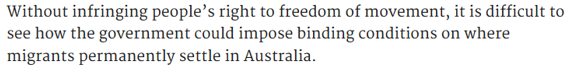 行动自由是人的基本权利,政府想要把这点作为强制条款加入到移民签证上是非常难的,换句话说,用签证条款来限制基本人权是违背法律宗旨的。(其实何必那么麻烦呢,直接多发489签证,少发190签证问题不就解决了?