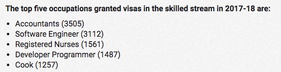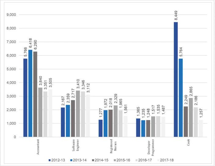 2017 - 18年技术流程中获得签证的前五名职业是:会计(3505个)、软件工程师(3112个)、 注册护士(1561个)、开发人员程序员(1487个)、厨师(1257个)。