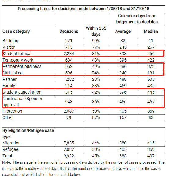 AAT公布的2018年5月1日——2018年10月31日期间不同签证类型案件审理的参考时间如下: