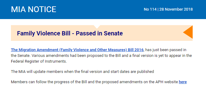 2018年12月10日,新的移民修订法案2016(家庭暴力和其它措施)Migration Amendment (Family Violence and Other Measures) Bill 2016 在议会讨论通过。