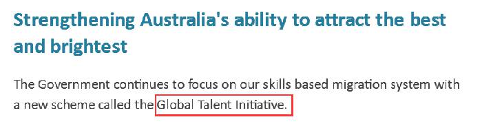 Global Talent Initiative主要是在全球范围内挑选出类拔萃的人才,促进澳洲经济进一步增长和繁荣。该 Initiative目前还在酝酿中,为保证其顺利实施和运行,政府为此投资1290万澳元。