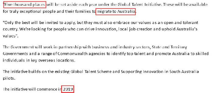 “澳洲在吸引卓越人才方面可谓名闻遐迩,这要归功于澳洲良好的治安、稳定的经济和充足的机会。我们可以通过Global Talent Initiative继续吸引高端人才,促进创新,增加澳洲工作机会并维护澳洲的价值观,每年将发放5000个名额,申请人可携带家属一起移民澳洲。”