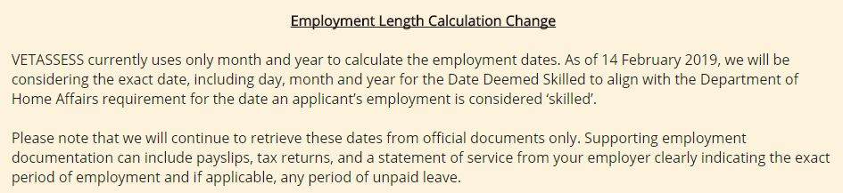 VETASSESS职业评估系统,目前只使用月份和年份来计算雇佣日期。在2019年2月14日起,将精确到确切日期,包括日期、月份和年份。