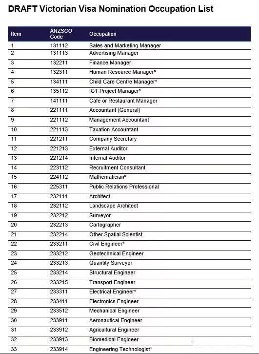 虽说政府明面上发起意见征集令,但私下显然也是有准备的。目前维州政府刚刚公布了190和489签证提名职业列表清单草案!草拟的大表如下: