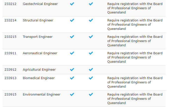综上所述,土木工程师、机械工程师、电气工程师、岩土工程师、结构工程师、交通工程师、航空工程师、农业工程师、生物工程师、环境工程师等工程职业,只要有5年以上工作经验,EOI打分裸分达到55分,那就可以申请昆士兰州担保移民澳洲啦!不过昆州本财年已经全面关闭州担保了,等到新财年2019年7月1日就会重新开放,工程师们可以趁这段时间把职业评估和BPEQ认证做好就可以等待开放申请了。