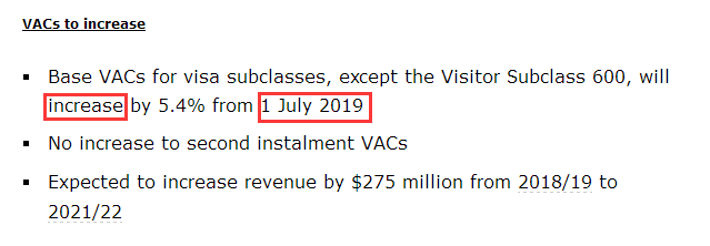 从2019年7月1日起,除600旅游签外,其他所有签证的申请费将增加5.4%。不增加二次签证费(Second instalment VACs)